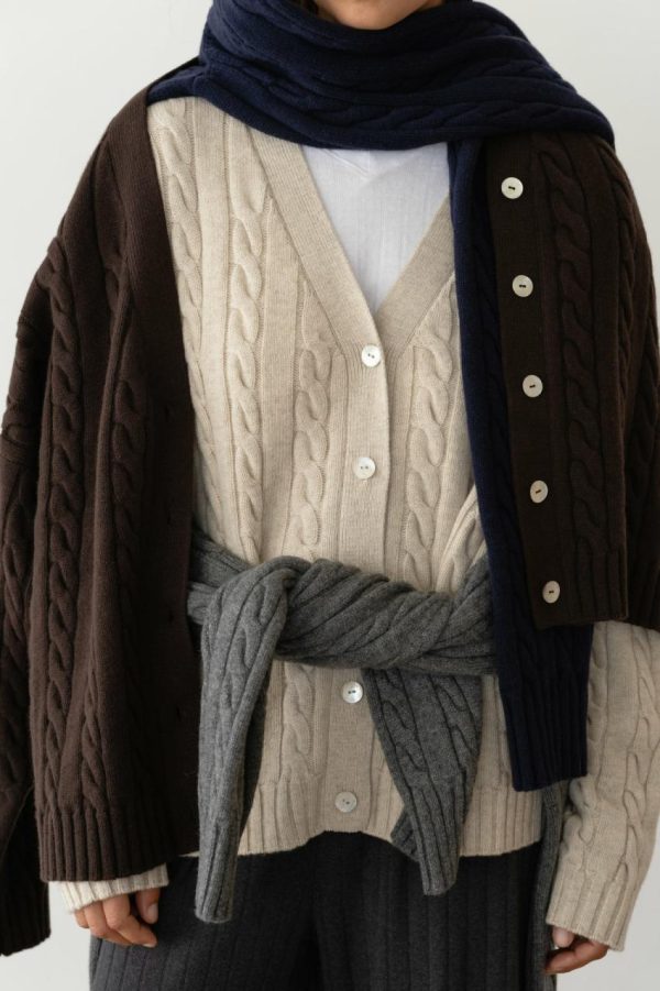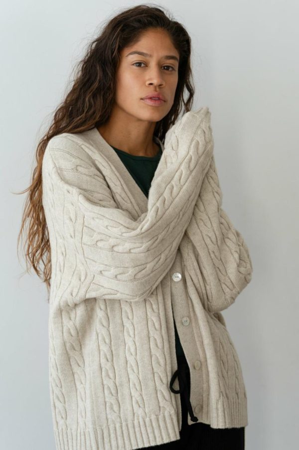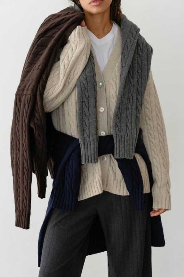 Experience the ultimate in luxury with our Cable V-Neck Cardigan, expertly crafted from 85% Wool and 15% Italian Cashmere for the perfect balance of softness and warmth. Featuring a relaxed silhouette that drapes beautifully, this elegant v-neck design is enhanced with sophisticated mother of pearl buttons and classic cable knit detailing.