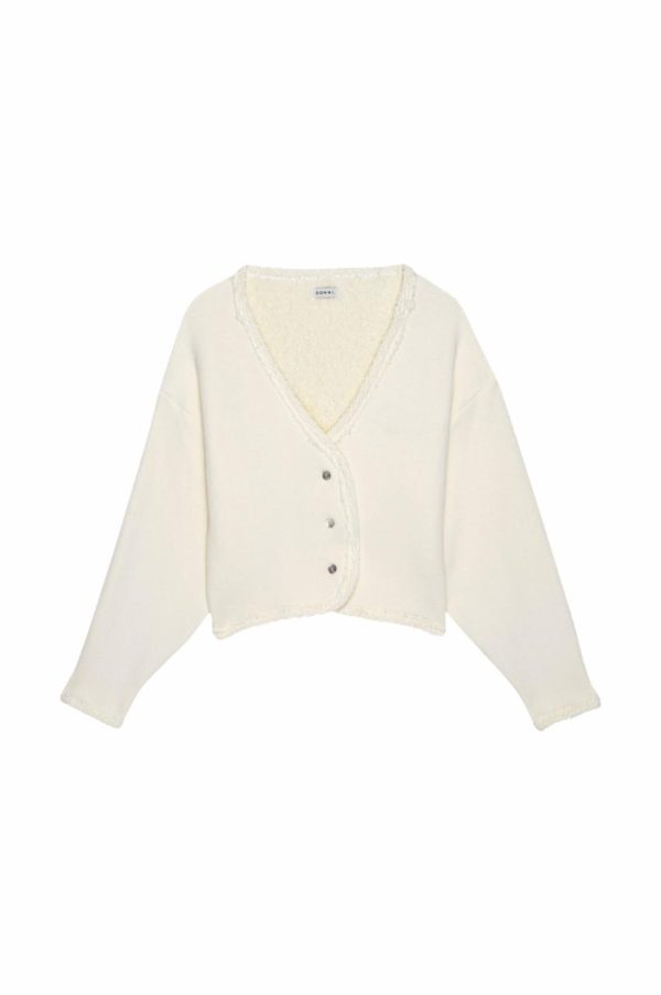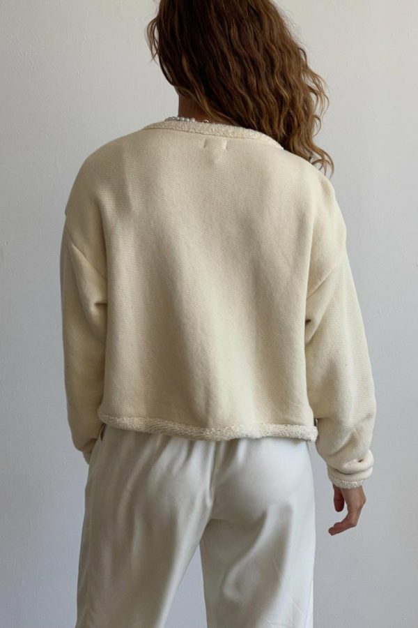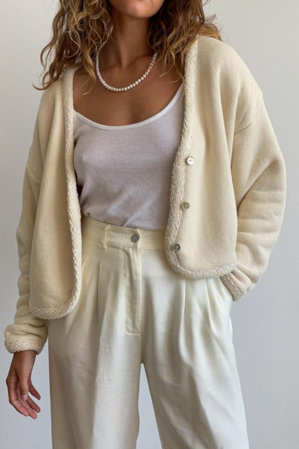 poodle cardi set in a soft, substantial plush cotton with terry interior. has a slightly oversized, boxy fit and mother of pearl button detail