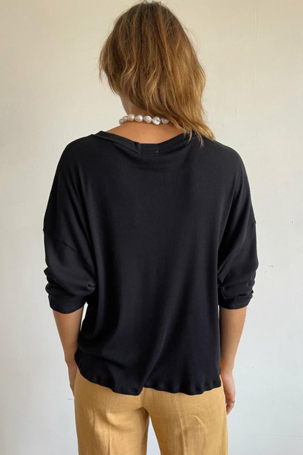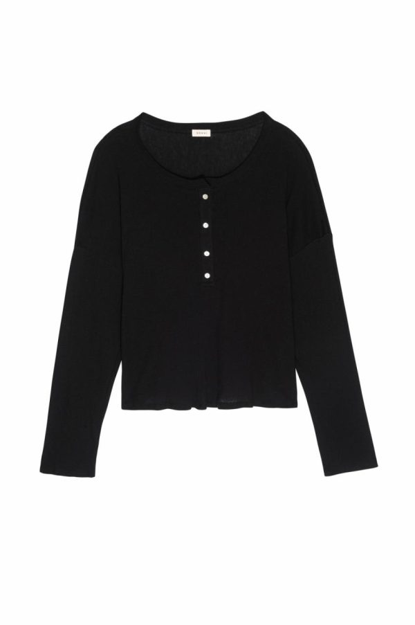 rib henley long sleeve with mother of pearl button detail. set in a lightweight, super soft cotton/modal fabric.