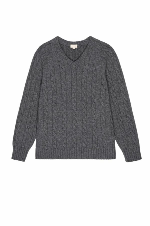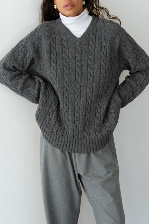 The Cable V-Neck Sweater is crafted from 85% Wool and 15% Italian cashmere, the perfect balance of softness and warmth. Designed with a relaxed silhouette, v-neck, and cable knit design.