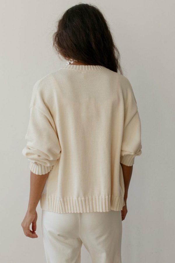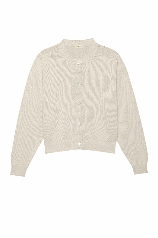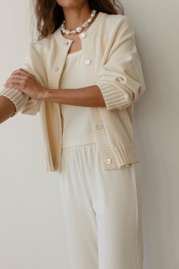 The Cotton Knit Cardigan is crafted with 100% Organic Cotton, featuring a slightly oversized fit, mother of pearl buttons and ribbed edges.