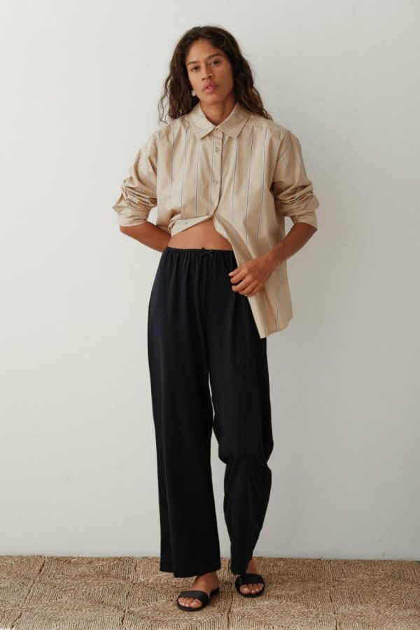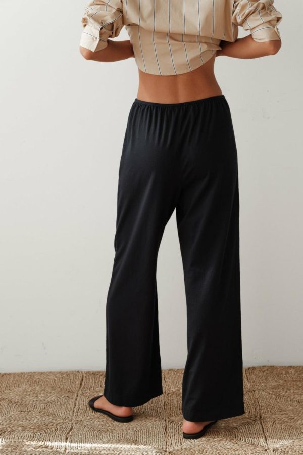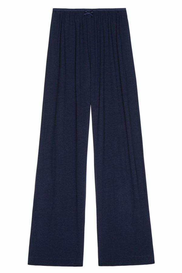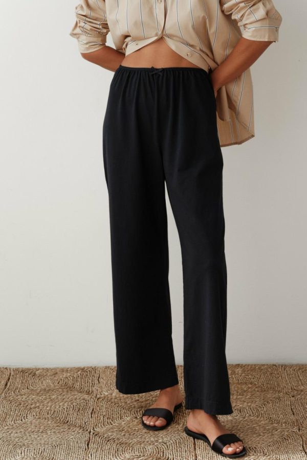 The Jersey Bow Simple Pant is crafted from ultra-soft, mid-weight supima cotton jersey. Featuring a straight-leg, bow detail, and elastic waistband with grosgrain ribbon trim.