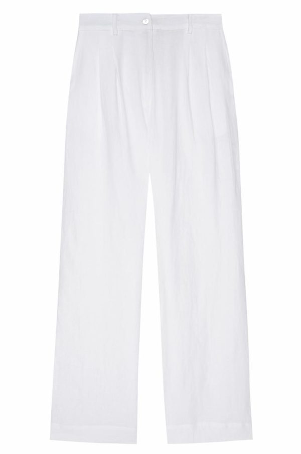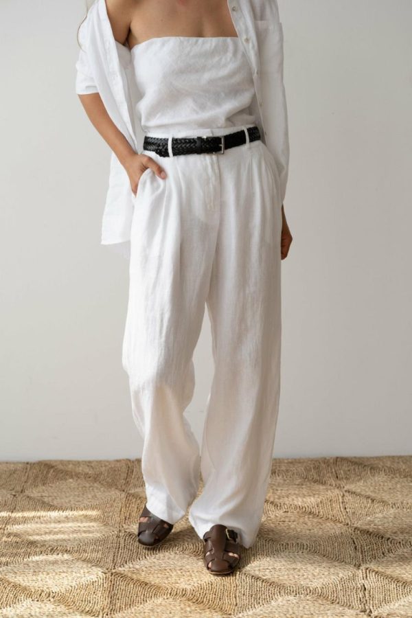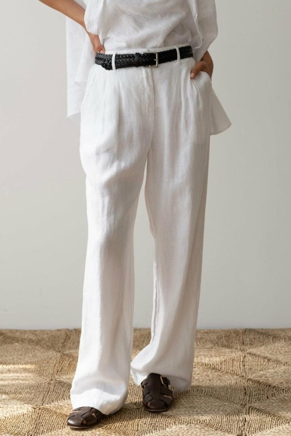 Relaxed yet refined, The Linen Pleated Trouser is crafted from our lightweight linen fabric. Featuring, a wide leg silhouette, side pockets, front pleats, and finished with a mother of pearl button.