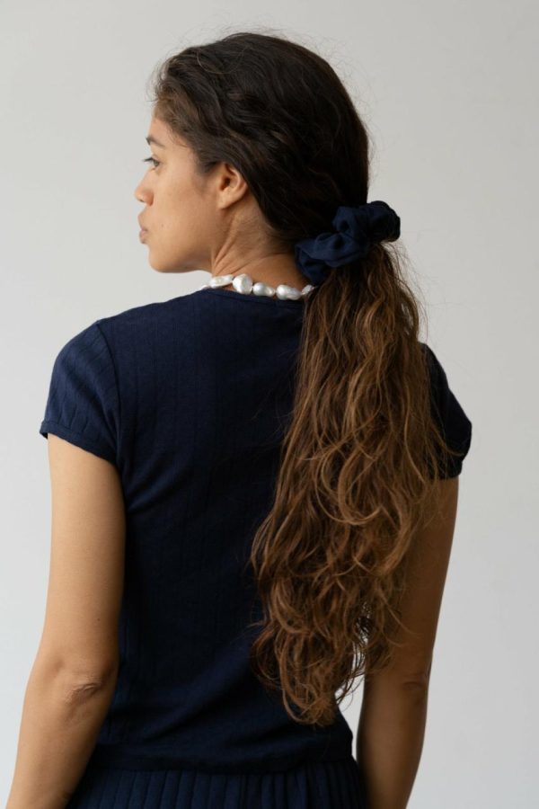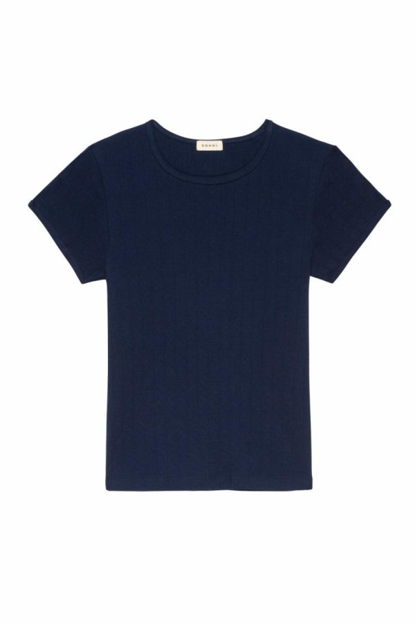 The Pointelle Baby Tee is crafted with 100% Organic Cotton, featuring a slim-fit, crewneck, and cap sleeves.