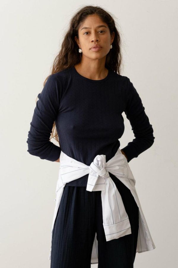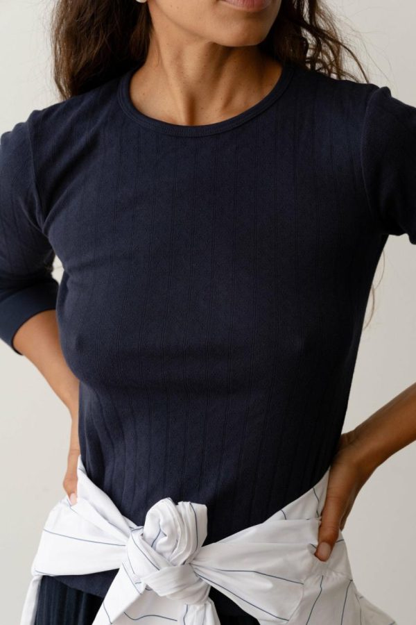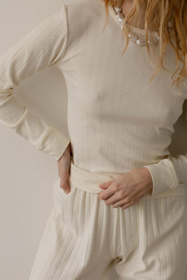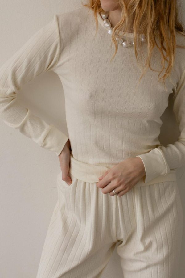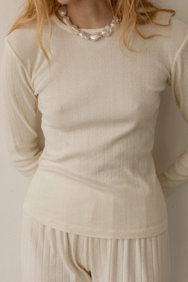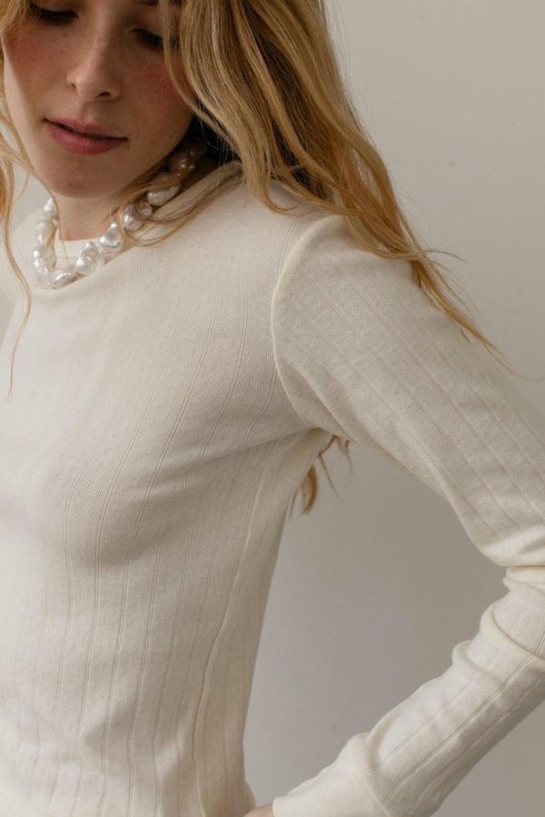 Crafted from 100% Organic Cotton, The Pointelle Long Sleeve features a slim fit, crew neckline, pointelle detailing, and baby rib cuffs.