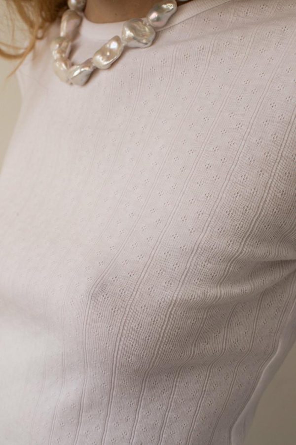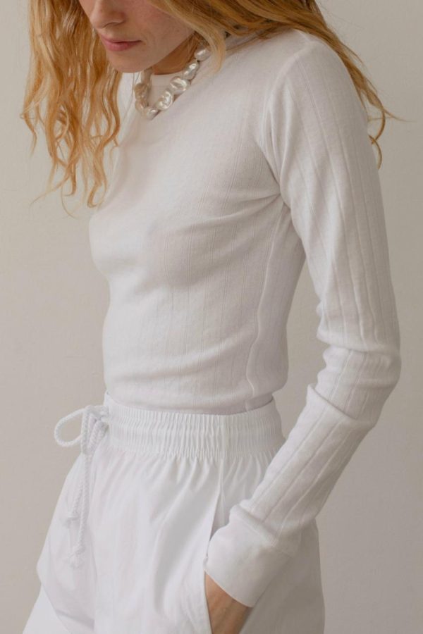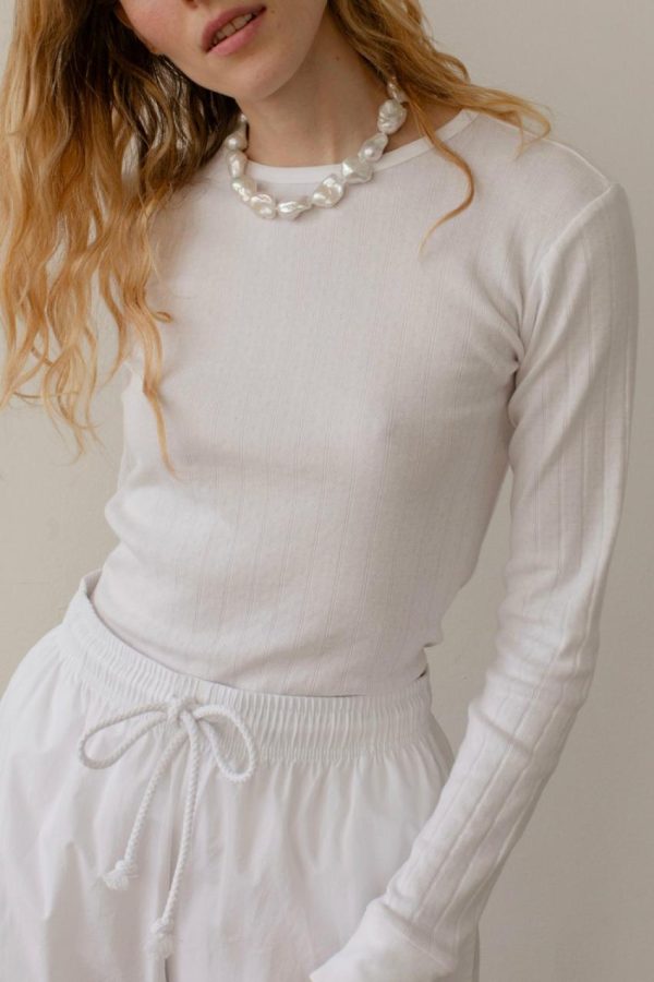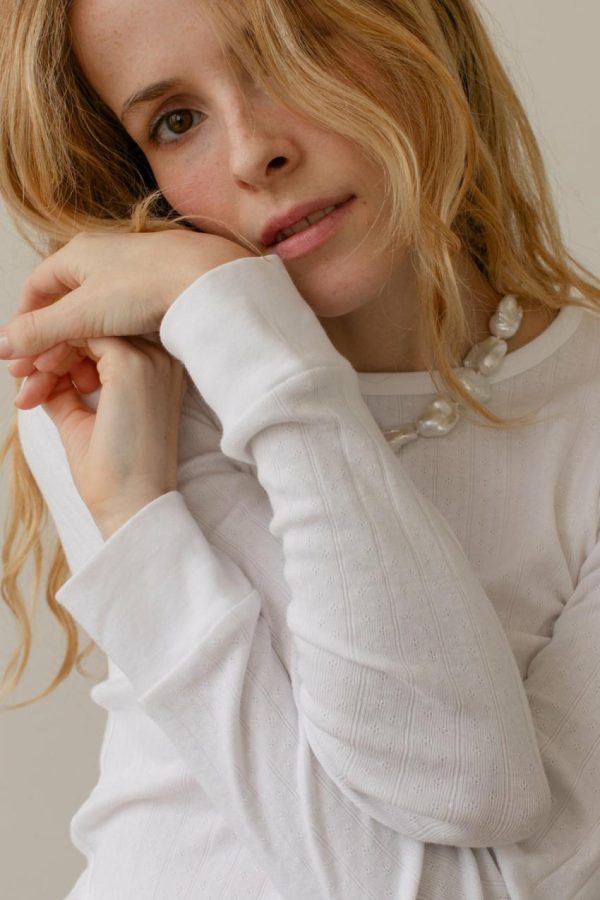 Crafted from 100% Organic Cotton, The Pointelle Long Sleeve features a slim fit, crew neckline, pointelle detailing, and baby rib cuffs.