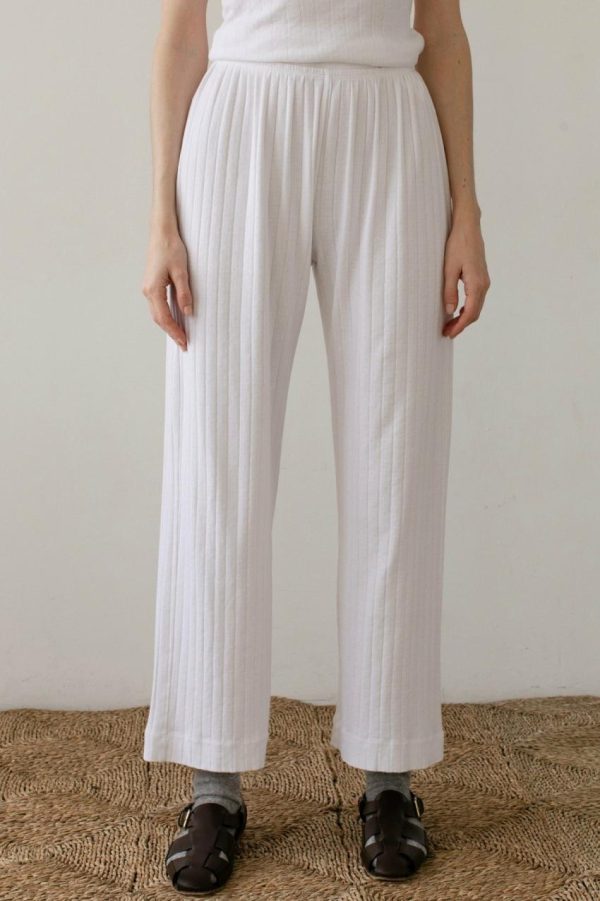 The Pointelle Simple Crop Pant is crafted with 100% Organic Cotton, featuring a cropped fit, wide leg and elastic waist.