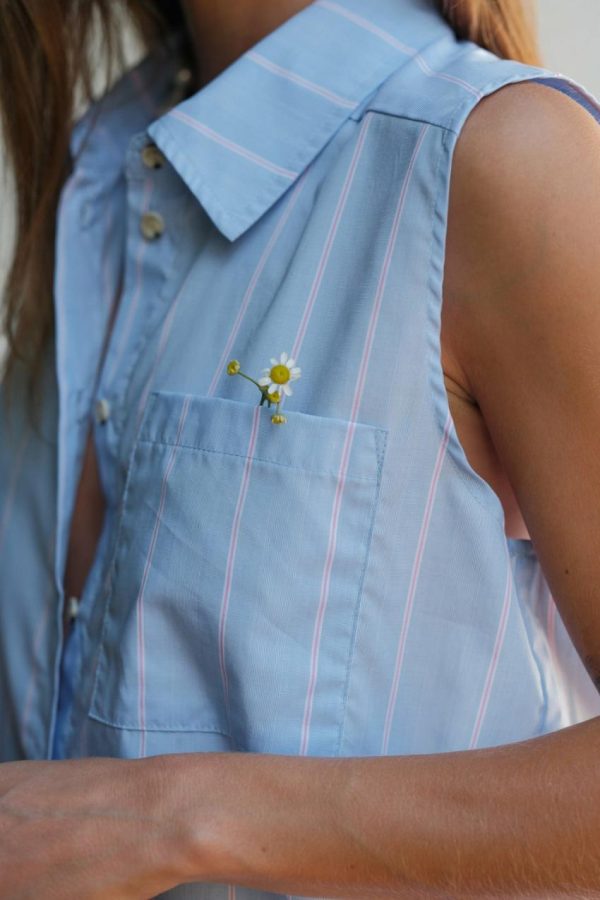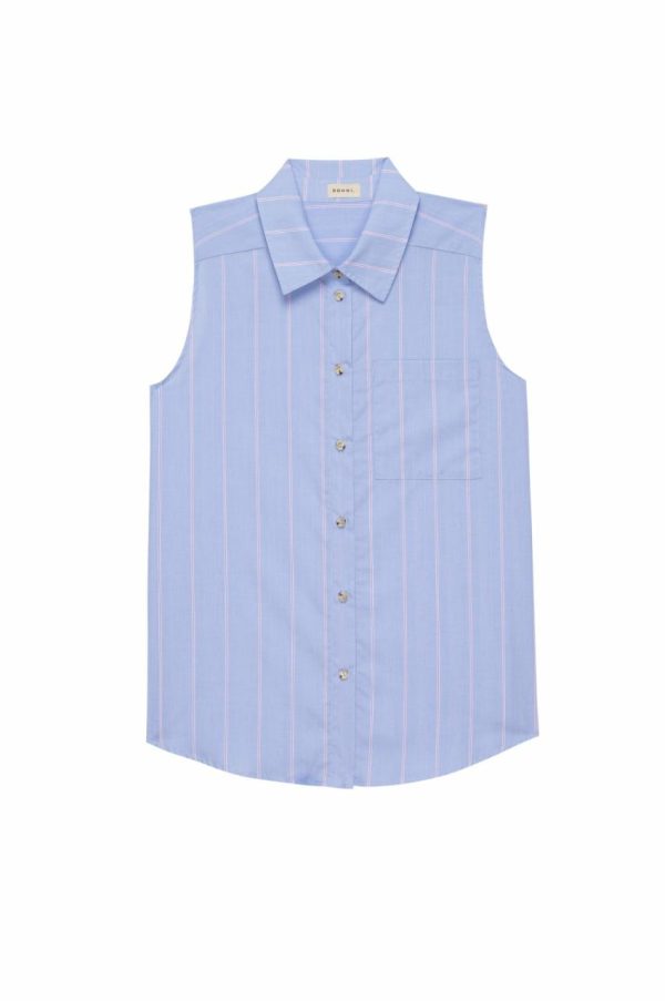 The Pop Sleeveless Shirt is crafted with 100% Cotton Poplin, featuring a collared neck, tortoise-like buttons and left chest pocket.