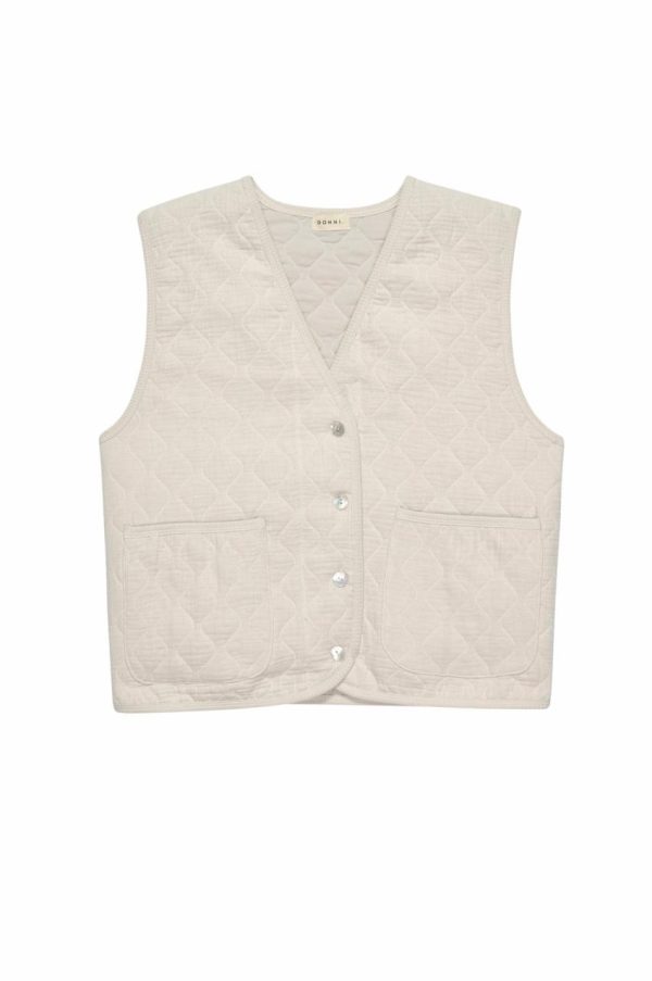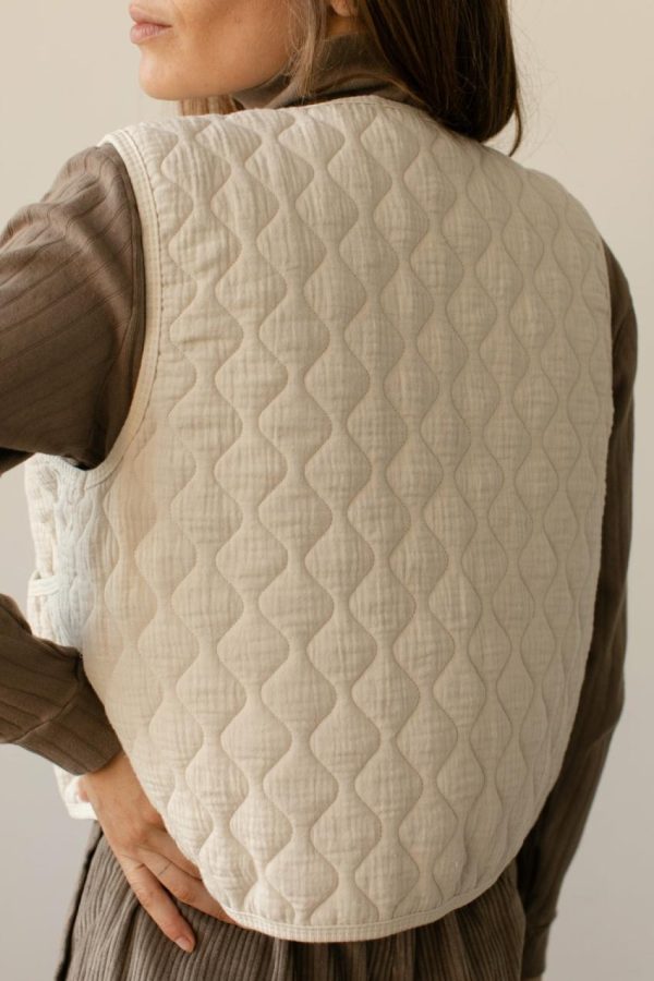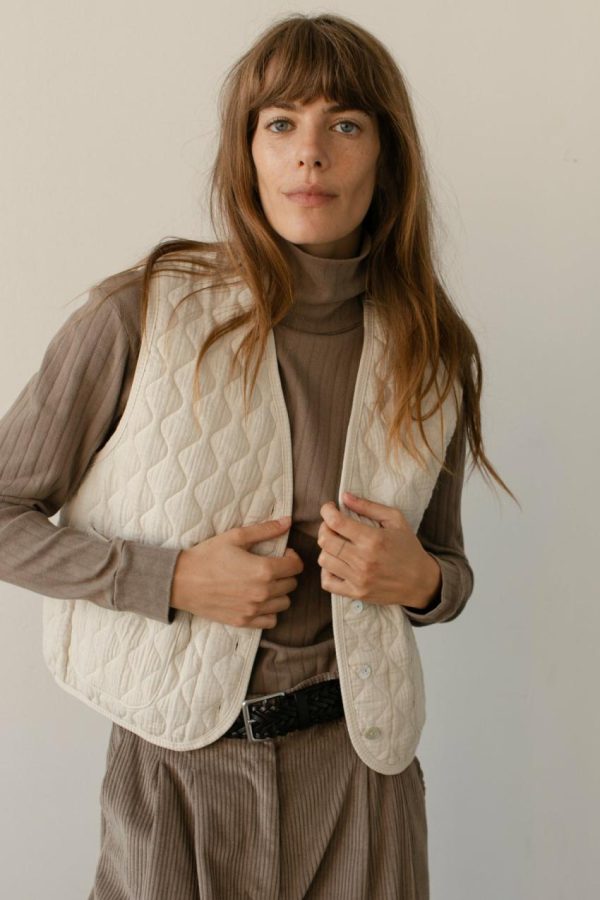The Quilted Vest can be worn on its own or layered with ease, featuring quilted texture, mother of pearl buttons and contrast interior lining.