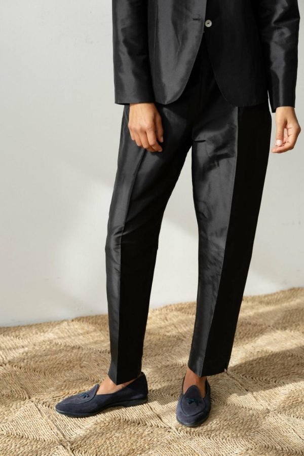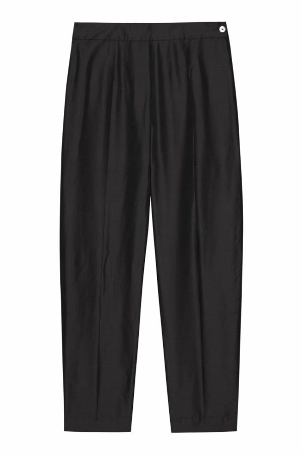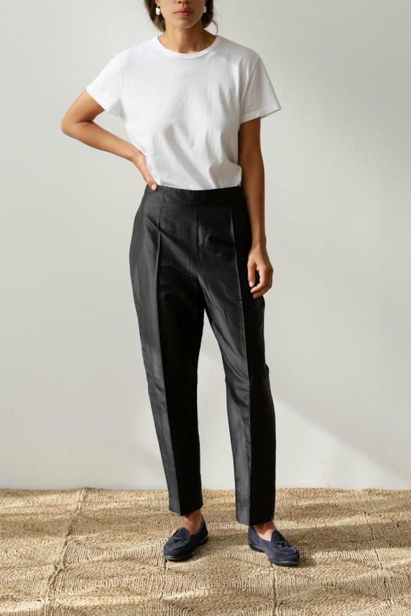 The Taffeta Cigarette Pant is crafted from 100% silk and designed with a tailored, slim fit. It features a high-rise, straight-leg, and cropped hem.