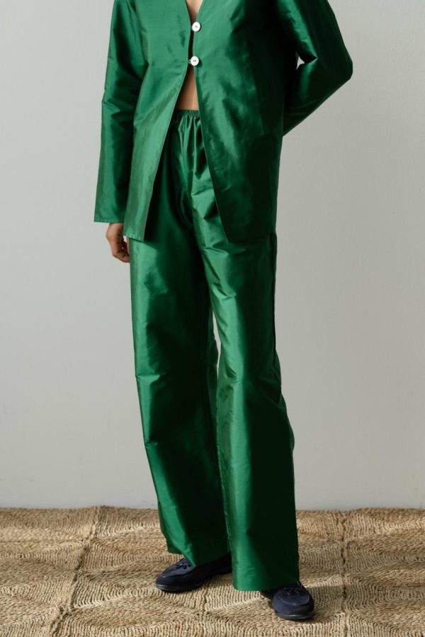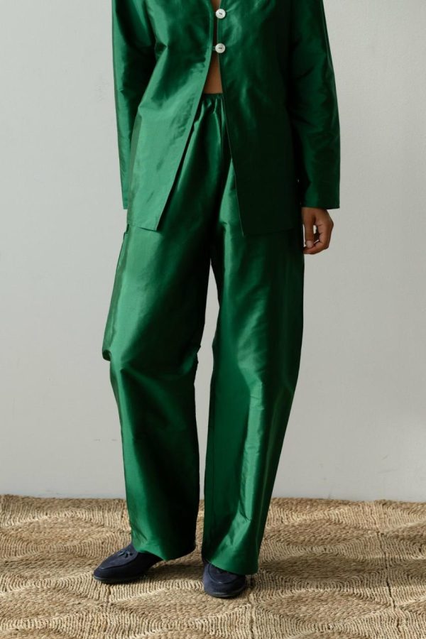 The Taffeta Simple Pant is effortless yet elevated. Crafted from our 100% silk taffeta fabric with an elastic waistband, and wide leg silhouette silhouette.
