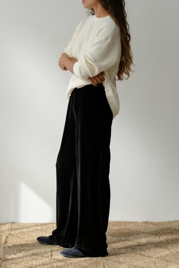The Velvet Simple Pant combines luxury with comfort. Crafted from luxe velvet, it features a relaxed, wide-leg silhouette and an elastic waistband for an easy, pull-on fit.